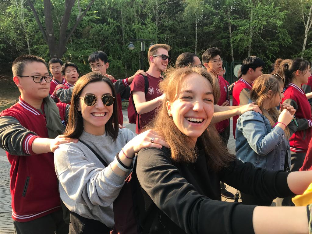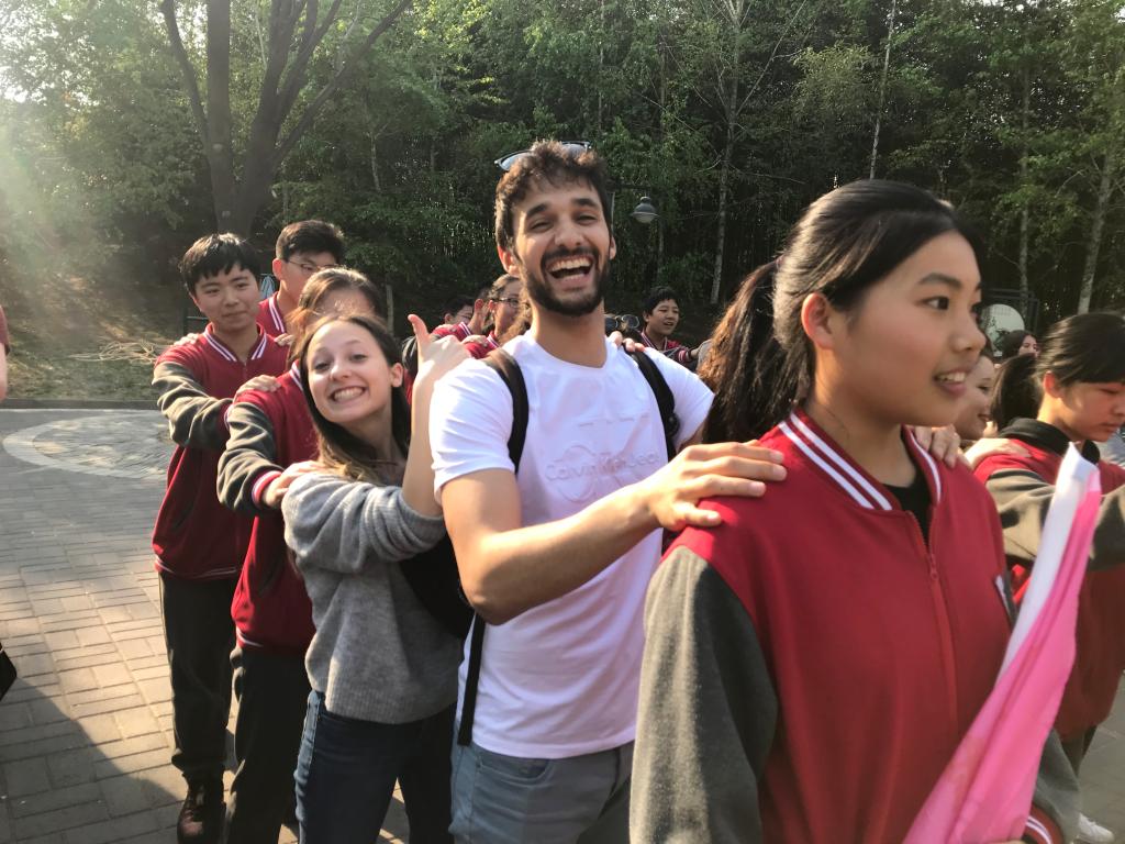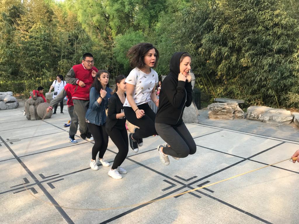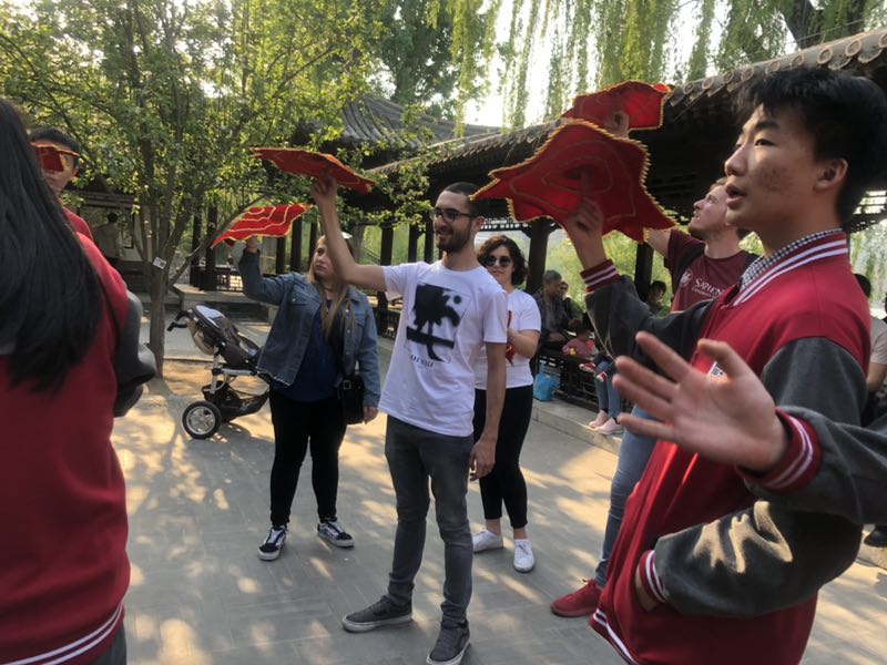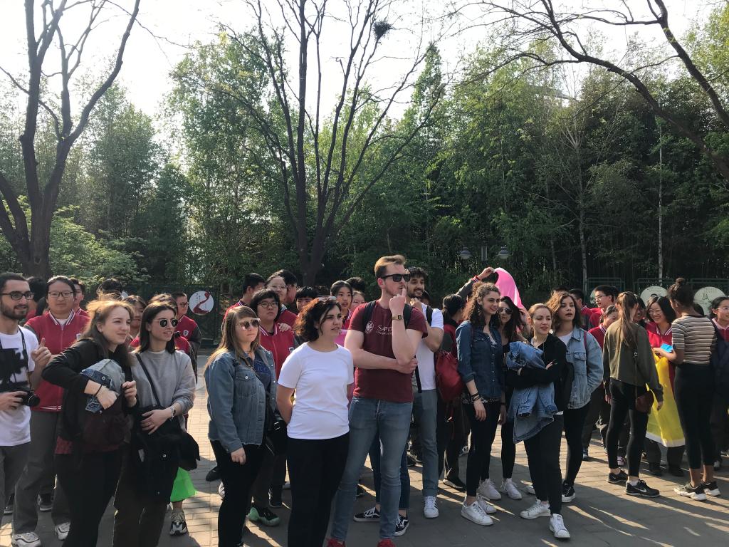 2019年4月15日星期一下午,beat365平台官方网站中文学院对外汉语系2018级意大利罗马班的全体留学生与北外附中初三、高一年级学生共同参加了在紫竹院公园举办的“青春飞扬,舞动春日” “1+3”年级趣味运动会。