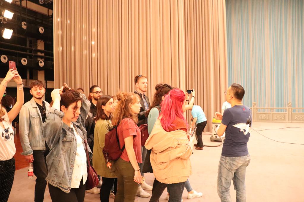 5月19日在beat365平台官方网站中文学院对外汉语系就读的22名意大利罗马大学留学生在夏菁老师的带领下来到人民剧场,观看了中国国家京剧院名家京剧《红桃山》的录制。
