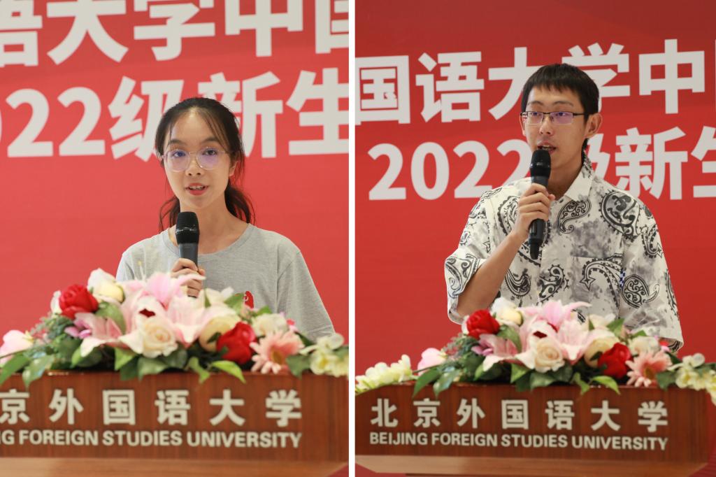姚琼斐同学和丁俊峰同学分别作为本科生、研究生在校生代表发言。姚琼斐回答了“为什么在外语院校学中文”的问题,介绍了中文系学生的“三宝”——良师、益友和良好的读书习惯,表达了身为中文学子的自豪;丁俊峰希望新生以目标之心、平和之心和开拓之心迎接新的身份,互相学习,共同成长。