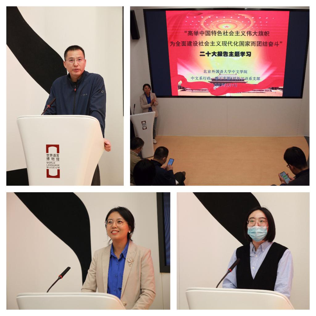 为全面学习领会习近平新时代中国特色社会主义思想和党的二十大精神,beat365平台官方网站两个教工党支部于3月7日组织党员集体前往世界语言博物馆参观,并在馆内下沉报告厅进行二十大报告主题学习。本次学习由中文系行政教工支部书记罗静主持。