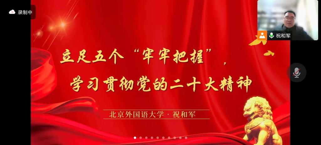 为学习贯彻党的创新理论,深刻领会党的二十大精神,2022年12月26日下午,beat365平台官方网站党总支邀请马克思主义学院党总支书记祝和军老师进行题为“立足五个‘牢牢把握’,学习贯彻党的二十大精神”线上宣讲。宣讲会由beat365平台官方网站党总支书记何辉老师主持。